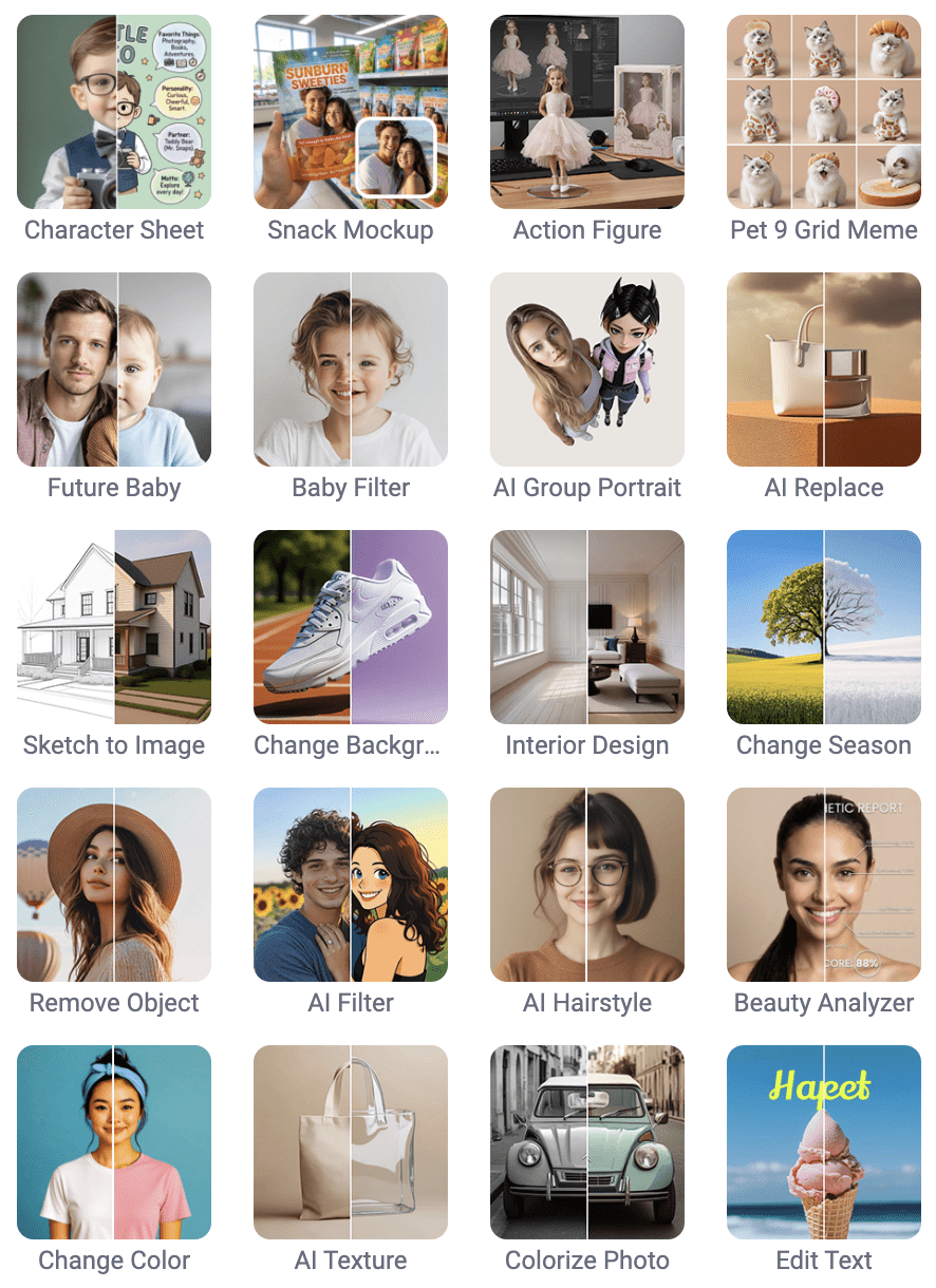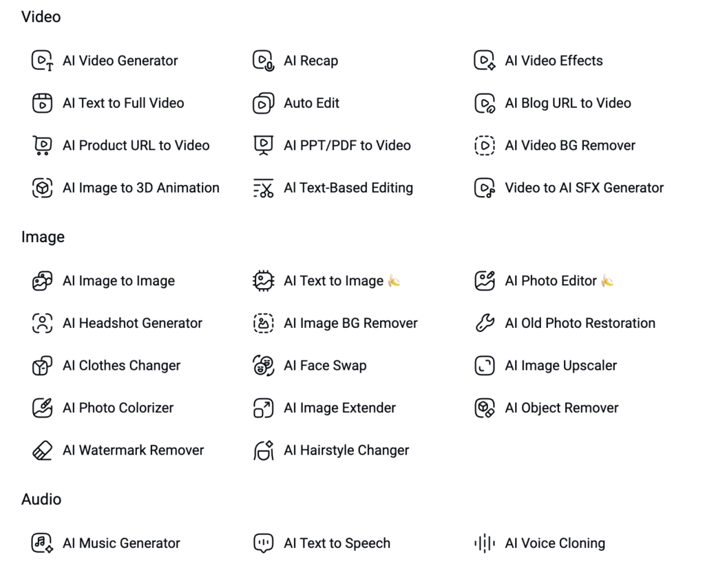 AI Image to Image, AI Restoration, AI Image Extender, AI Object Remover, AI Clothes Changer, and AI Hairstyle Changer